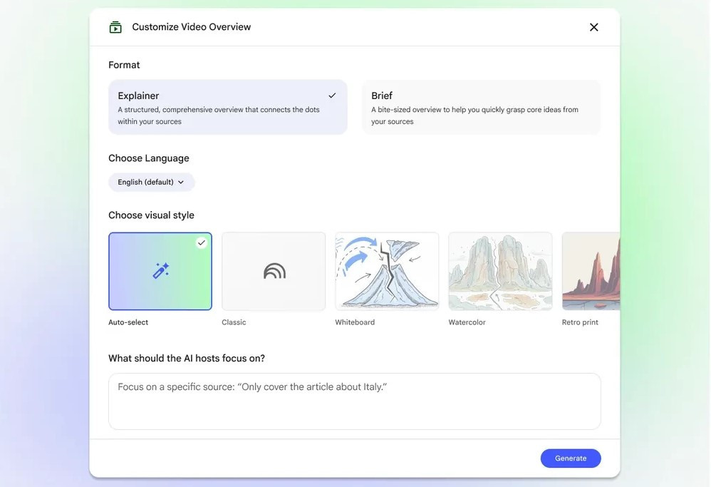 Tıpkı “Audio Overviews” özelliğinde olduğu gibi, Video Overviews için de yeni biçimler geldi. Artık kullanıcılar: