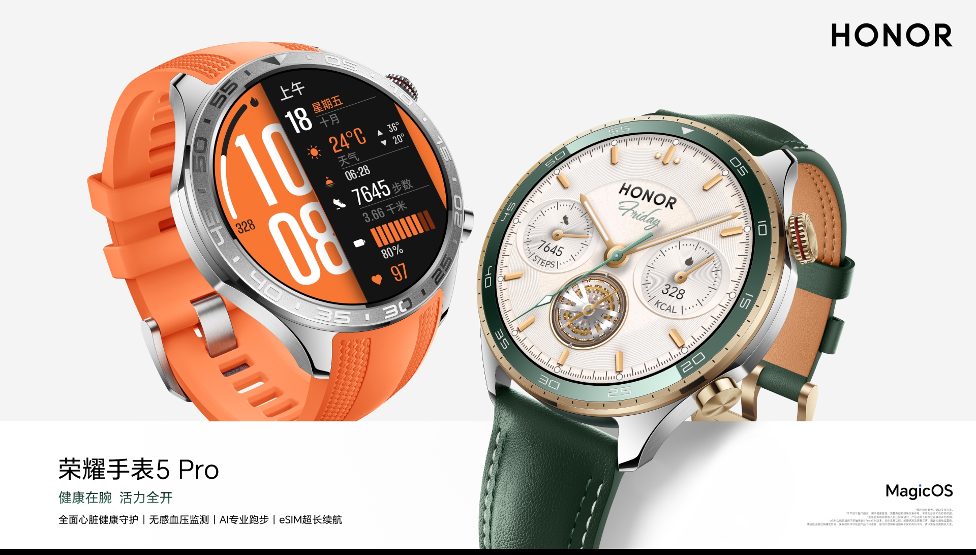 Honor, Watch 5 Pro modelinde metal kasalı ve dakika göstergeleriyle işaretlenmiş çerçeveye sahip, neredeyse klasik saat tasarımını tercih etti. Sağ tarafta digital crown ve ek bir düğme bulunuyor. Saat, deri ve spor kayış seçenekleriyle sunuluyor. Fotoğraflar, tırmanma aktivitesinin yanı sıra pusula, aktif yakılan kalori ve mevcut rakım gibi bilgileri gösteren komplikasyonları da gösteriyor. Honor Watch 5 Pro, 46 mm uzunluğunda, 0.44 inç kalınlığında, 50 metreye kadar suya dayanıklı kasaya sahip. 1.5 inç AMOLED ekran, 466 x 466 piksel çözünürlük sağlıyor. Saat, 515 mAh bataryadan güç alıyor. Honor, saatin tam şarjla 15 güne kadar dayandığı iddia ediyor. 64 MB bellek, 8 GB depolama alanı ve dahili mikrofon ve hoparlörlerle geliyor.