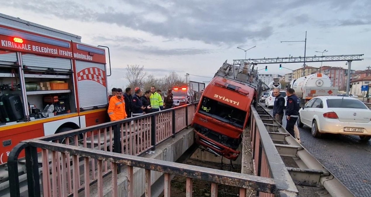Kırıkkale’de seyir halindeki bir itfaiye aracı, lastiğinin patlaması sonucu kontrolden çıkarak iki köprü arasındaki boşluğa sıkıştı. Kazada üç itfaiye personeli yaralandı