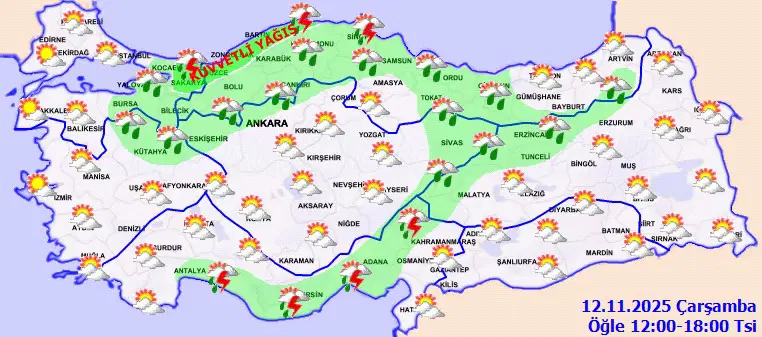 Meteoroloji, 12 Kasım hava durumu raporunu yayımladı. Rapora göre; Bursa, İstanbul, Kütahya, Adana, Antalya, Ankara, Çankırı, Eskişehir, Bolu, Düzce, Sinop, Zonguldak, Amasya, Samsun, Trabzon, Erzincan, Dersim, Bingöl ve Malatya’da sağanak ve gök gürültülü sağanak bekleniyor.